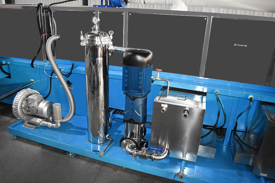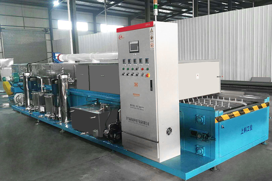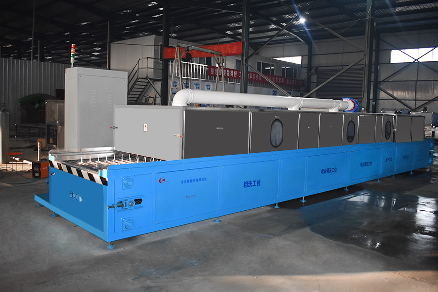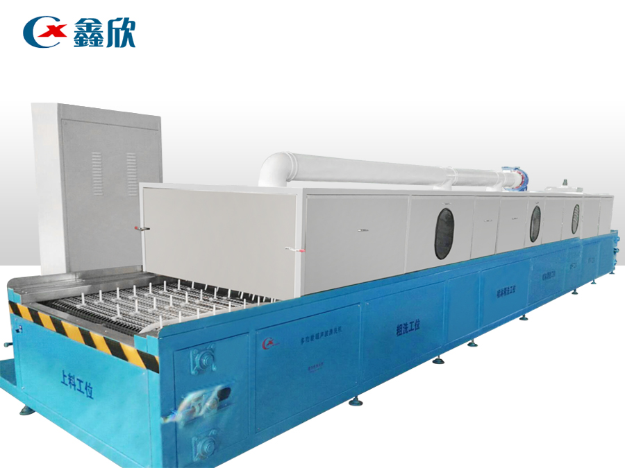 該設備有上下料網帶、超聲波清洗工位、噴淋漂洗工位、高壓風切、熱風烘干工位、溫控水加熱系統(tǒng)、風機、溫控空氣加熱系統(tǒng)、移動式風刀、PLC+觸摸屏控制系統(tǒng)、管路系統(tǒng)及智能電器控制系統(tǒng)等組成。自動進排液和自動加溫系統(tǒng)完全實現(xiàn)了無人干預,自動運行,很大程度上降低了工人的勞動強度。先進的霧氣處理系統(tǒng)可以將清洗時產生的霧氣冷凝回流,空氣經過濾和活性炭吸附后排出。