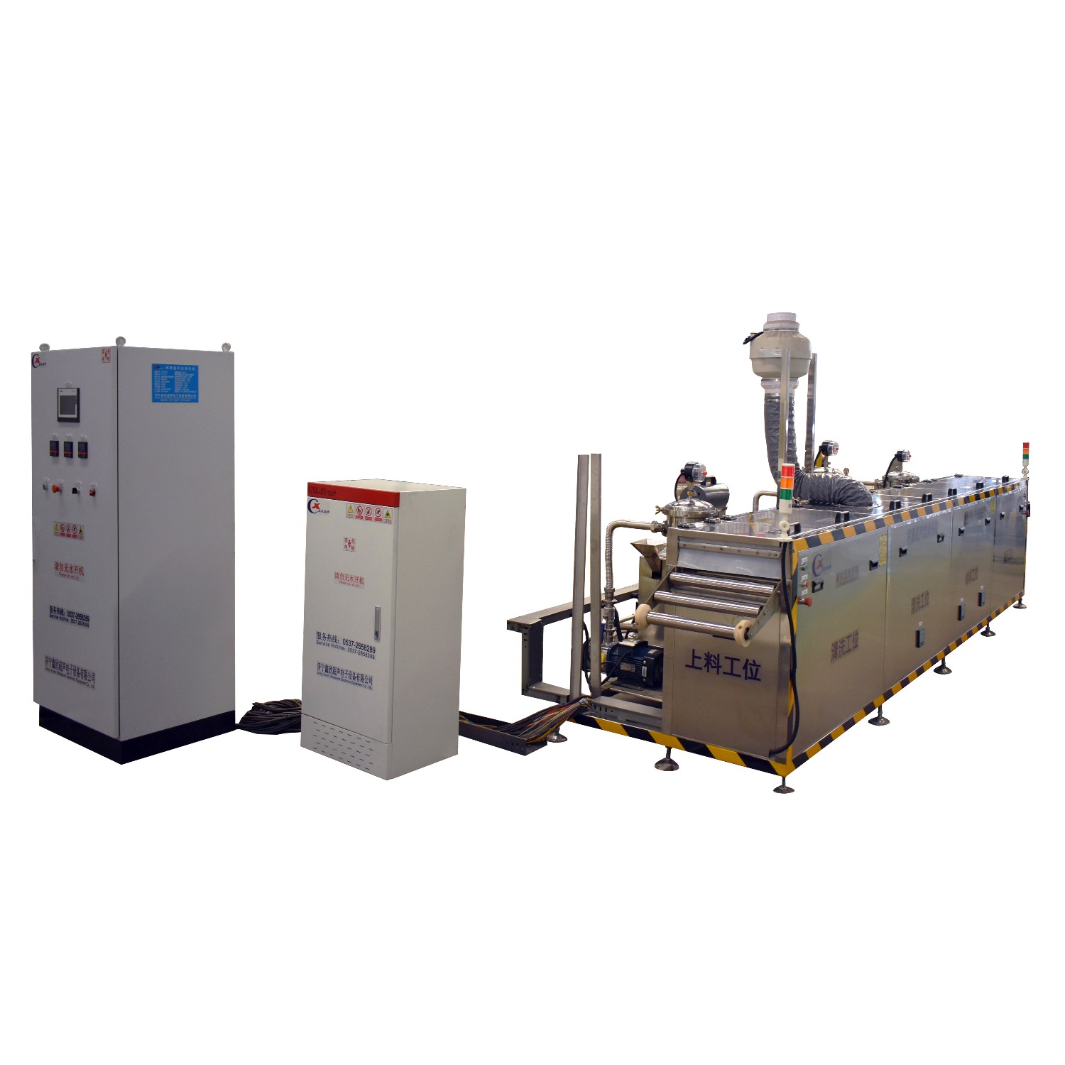 該設備為全自動高潔凈度清洗機,采用2%氫氧化鈉溶液以及純水清洗、超聲波清洗、噴淋清洗工藝。整機為半封閉式結構,主要動力源為動力輸送裝置,PLC自動控制。該設備共有六個工位:與上工序接料對接工位、超聲波清洗工位、噴淋漂洗工位1、噴淋漂洗工位2、高壓風切工位、動力滾筒對接收料工位。該設備清洗效果好,提高了此類工件的潔凈度。該機構設計及工藝安排合理、自動化程度高、清洗精度高,有效的解決了此類工件的清洗難題。